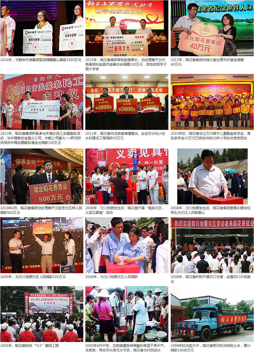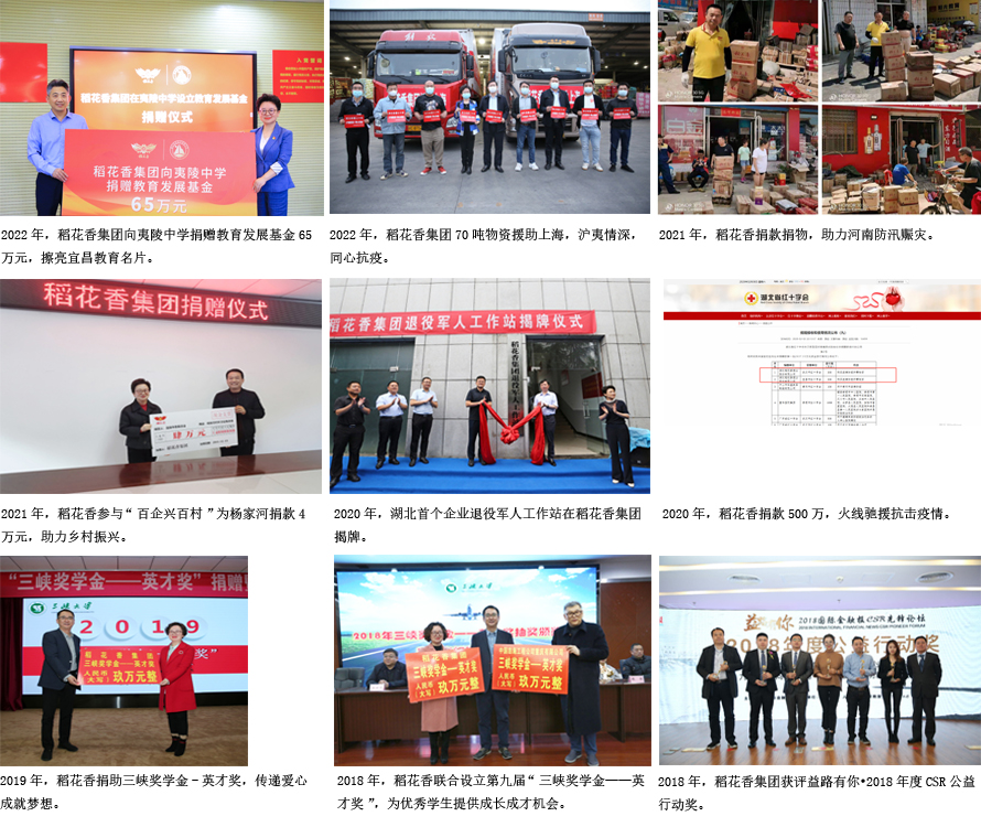 40年來,稻花香在加快自身高速發展的同時,積極踐行社會責任,投身公益事業,參與脫貧攻堅,助力鄉村振興,帶動百姓致富。集團舞活白酒龍頭,形成“一主三輔”產業集群新格局;以工業反哺農業,惠及一方百姓;發揮產業支撐和引領作用,帶動地方經濟發展和農民增收致富;加強培訓就業,增強農民“造血功能”,轉移剩餘勞動力就業;在精準扶貧過程中,進行城鄉互聯、村企對接、結對共建,助推產城共建、產城共融,致富一方百姓,形成了政企農三方共贏、相互促進、共同發展的良好局麵。積極捐款捐物,參與全民抗疫阻擊戰,馳援河南防汛救災,彰顯了支柱企業的責任與擔當。