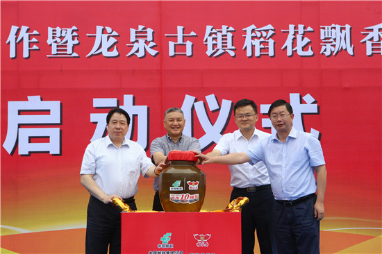 宜昌市人民政府副市長王應華,中國郵政集團公司湖北省分公司黨組書記、總經理任永信,夷陵區委書記、區人大常委會主任王璽瑋,稻花香集團常務副董事長、總經理、稻花香酒業公司總經理蔡開雲共同為稻花飄香典藏酒壇注酒、加蓋、封壇,正式啟動龍泉古鎮稻花飄香主題郵局。