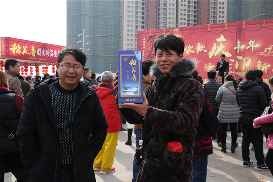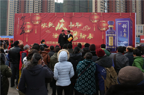 2月1日早上9點,離演出開始還有整整1小時,點軍區橋邊鎮東方廣場上就已經聚集了數百名慕名而來的觀眾,數九寒冬似乎阻擋不了“粉絲”們對稻花香的熱情。“聽說今天稻花香在這裏搞活動,買酒有優惠,還有文藝節目,我專門過來湊湊熱鬧,提前感受一下年味兒……”一位年輕的小夥子左手提著一件活力型,右手抱著一件珍品一號,臉上洋溢著幸福的笑容。