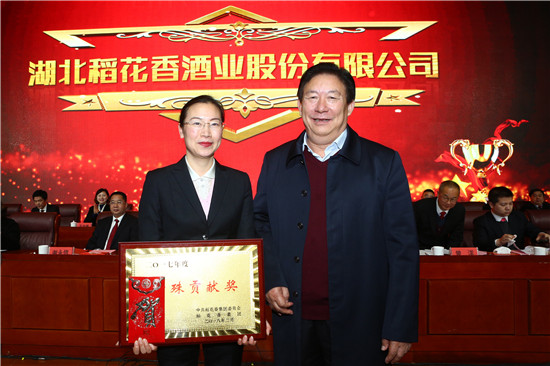 集團黨委書記、終身名譽董事長蔡宏柱為“特殊貢獻獎”獲獎單位稻花香酒業頒獎,並對集團2018年重點工作進行安排部署。他表示,2018年是稻花香開啟新起點、新征程、新跨越的開局之年,要搶抓實體經濟發展的機遇、白酒行業回暖的機遇、龍泉鎮騰飛的機遇,深入推進“五大轉型”,著力建設“實力稻花香、活力稻花香、魅力稻花香”的發展思路;貫徹落實“燎原戰術”,重點培育四大係列產品,引導主流消費群體;著力打造“一主三輔”,堅定不移做大做強白酒主業,做精做優物流、配套等優勢產業,加速推進旅遊產業。他要求全體稻花香人堅定信心、明勢善謀,創新求變、精準施策,搶抓發展先機,勇當新時代“弄潮兒”,團結拚搏實現更大作為,推動稻花香實現從“500億”到“1000億”的再一次跨越。