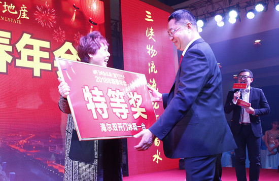 當晚的新春年會在三峽物流園、宏信地產領導班子大氣磅礴的《三峽物流園賦》朗誦中拉開帷幕。精彩紛呈的歌舞節目、雜技表演、互動抽獎營造了濃厚氛圍。舞蹈《花開盛世》美妙動人,描繪了三峽物流園錦繡前景;獨舞光影秀《水世界》明暗變幻,美輪美奐;雜技表演《快樂廚師》扣人心弦,精彩萬分;延泰商貿公司老板韓佳利演唱的《好運來》給大家帶來喜慶的好彩頭,表達了對廣大賓客的美好祝願。節目過程中穿插的謝永信與賓客互動“發紅包”環節熱鬧不已,三項抽獎活動更是將年會氛圍推向高潮,終極大獎海爾雙開門冰箱最終花落一位幸運的商戶代表手中。