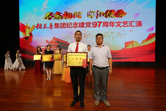 【概要描述】6月29日,稻花香大禮堂黨旗飄揚、紅歌嘹亮,以“不忘初心牢記使命”為主題的稻花香集團紀念建黨97周年大會暨文藝彙演在此隆重舉行。集團全體黨員、預備黨員、入黨積極分子及各成員企業班組長以上幹部共計千餘人歡聚一堂,以表彰先進、文藝彙演等多種形式重溫黨史、歌頌黨恩,凝聚發展合力,激勵全體稻花香人在實現千億稻花香夢的征程中奮勇前行。 稻花香集團黨委副書記方麗華主持大會。龍泉鎮委副書記張傑,龍泉鎮委