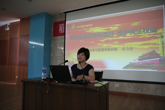 本次活動特邀中共宜昌市委黨校政治學與管理學教研室副教授李方芳授課。她圍繞“加強憲法實施和監督,維護憲法權威”這一主題,從我國憲法與依法治國關係、當前憲法實施困境及權威缺失、加(jia)強(qiang)憲(xian)法(fa)實(shi)施(shi)監(jian)督(du)措(cuo)施(shi)及(ji)重(zhong)視(shi)憲(xian)法(fa)教(jiao)育(yu)等(deng)方(fang)麵(mian),進(jin)行(xing)深(shen)入(ru)淺(qian)出(chu)的(de)講(jiang)解(jie)和(he)闡(chan)釋(shi),並(bing)著(zhe)重(zhong)強(qiang)調(tiao)貫(guan)徹(che)落(luo)實(shi)憲(xian)法(fa)精(jing)神(shen)對(dui)於(yu)經(jing)濟(ji)社(she)會(hui)進(jin)步(bu)及(ji)企(qi)業(ye)長(chang)遠(yuan)發(fa)展(zhan)的(de)重(zhong)要(yao)意(yi)義(yi)。她(ta)希(xi)望(wang)廣(guang)大(da)黨(dang)員(yuan)幹(gan)部(bu)要(yao)明(ming)確(que)自(zi)身(shen)的(de)權(quan)利(li)與(yu)義(yi)務(wu),充(chong)分(fen)相(xiang)信(xin)憲(xian)法(fa)、主動運用憲法,成為憲法的忠實崇尚者、自覺遵守者和堅定捍衛者,為實現中華民族偉大複興的中國夢凝聚磅礴力量,也為企業發展營造更好的法治氛圍與環境。