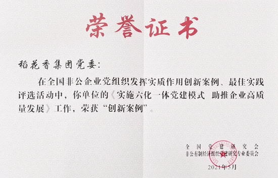 【概要描述】近日,在黨的百年華誕即將到來之際,稻花香黨建再傳喜訊:集團黨委《實施六化一體黨建模式 助推企業高質量發展》工作,榮獲全國非公企業黨組織發揮實質作用“創新案例”。這是集團黨委繼2011年榮膺“全國先進基層黨組織”之後,再次捧得國字號榮譽,“非公黨建標杆”實至名歸。