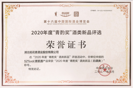 4月9日,第十六屆中國國際酒業博覽會舉行期間,2020年度“青酌獎”酒類新品頒獎盛典在瀘州市巨洋國際宴會廳隆重舉行,稻花香52度原漿酒獲得評審組一致認可,榮膺“青酌獎”酒類新品獎。