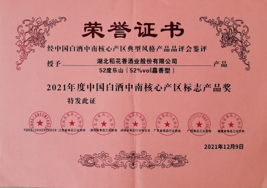 12月8日至9日,第三屆中國白酒中南核心產區高質量發展峰會在江西南昌舉行。稻花香酒業作為湖北省推薦的代表酒企參會,稻花香52度樂山(52%vol馫香型)在59款參評產品中脫穎而出,榮獲“2021年度中國白酒中南核心產品標誌產品獎”。