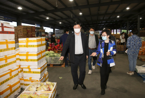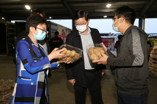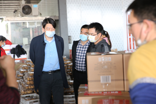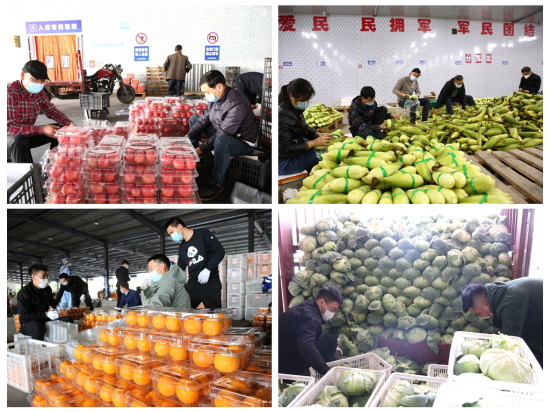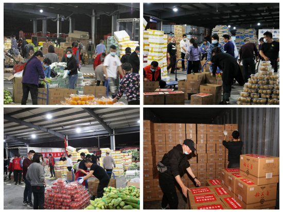 當天下午2點半,調集的包裝箱一到分揀平台,大家各就各位,數輛小推車魚貫而行,各類蔬菜、水果有序放入箱內,現場分揀、封箱、轉運、裝車各項工作忙而不亂,快速推進。時間緊、任務重,晚上陸續有物流園員工、園區商戶等前來支援,分揀包裝隊伍擴大到六七十人,大家爭分奪秒,全力奮戰,力爭在最短的時間完成分裝。
