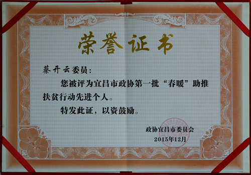 12月17日,宜昌市政協委員第一批“春暖”助推扶貧行動總結暨第二批“春暖”行動啟動儀式在南湖賓館召開,宜昌市政協委員、稻花香集團常務副董事長、總經理蔡開雲獲評市政協第一批“春暖”助推扶貧行動先進個人。