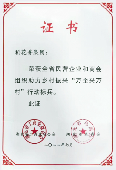 另據了解。稻花香集團旗下三峽物流園市場商會也積極參與到“萬企興萬村”活動中並同期獲評“行動標兵”。