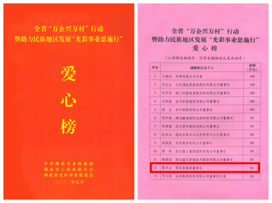 7月26日,湖北省“萬企興萬村”現場推進會暨助力民族地區發展光彩事業恩施行大會在恩施市召開。稻花香集團榮獲全省“萬企興萬村”行動標兵,集團董事長蔡開雲為“光彩事業恩施行”捐款50萬元。