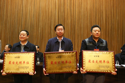2月16日,夷陵區三級幹部會議在平湖劇院隆重召開,稻花香集團榮獲2015年度“最佳文明單位”,集團常務副董事長、總經理、稻花香酒業公司總經理蔡開雲上台領獎並作典型發言。